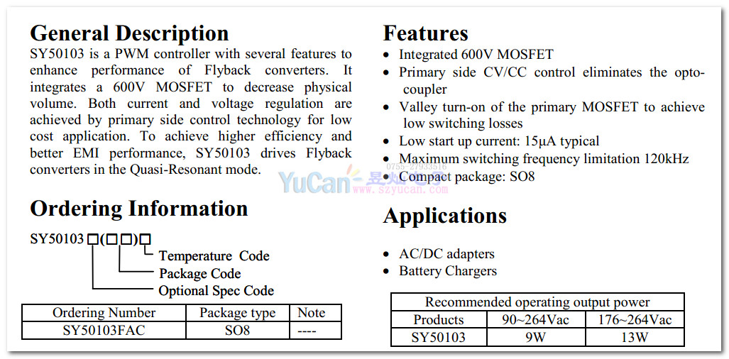 SY50103 內(nèi)置MOS管 高效率5V/1.8A AC-DC控制器